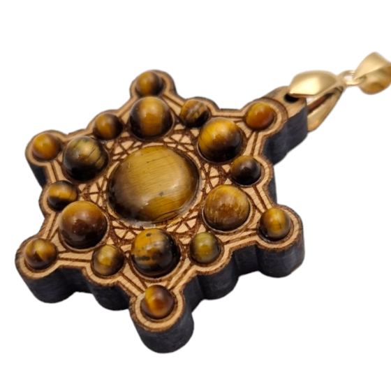 Pendentif en bois Soleil de vie, avec un cordon de 90 cm ajustable Déclinaisons : Jaspe rouge, labradorite, lapis lazuli, œil...