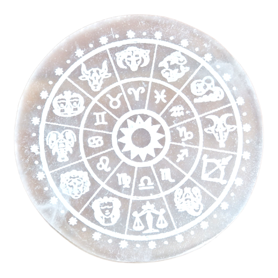 Sélénite - Disque Féminin sacré gravé à poser. Provenance : Maroc Taille 8 cm