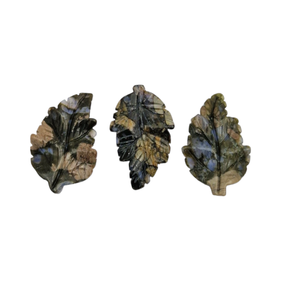 Pendentif gravé en labradorite Motifs végétaux Hauteur de 2 à 5 cm Bélière métallique Origine Madagascar